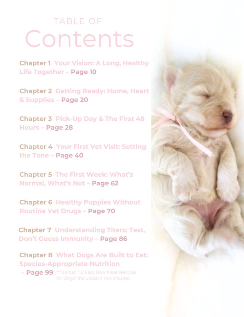 Inside Healthy Puppy Healthy Life, I walk you step‑by‑step from before your puppy comes home all the way through the first months of vet visits, training, and everyday care. Chapter 1 helps you get clear on your vision and what a truly healthy life looks like. Chapters 2 and 3 cover getting your home and heart ready, plus exactly what to do on pick‑up day and through those first 48 hours when everything feels overwhelming. Chapters 4 and 5 guide you through your first vet visit and the first week—what’s normal, what’s not, and how to avoid common mistakes. Chapters 6 and 7 explain how to support a strong immune system without over‑using routine vet drugs and how to use titer testing so you’re not just guessing about immunity. Chapter 8 dives into what dogs are actually built to eat, with simple, species‑appropriate nutrition guidance and easy raw recipes you can start right away.